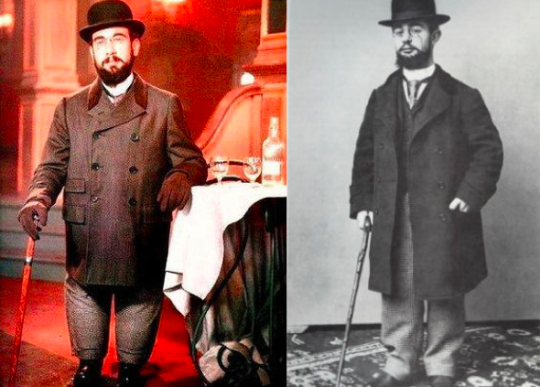 Jose Ferrer in Moulin Rouge (left), and Henri de Toulouse-Lautrec (right). Ferrer had his legs bound to his upper body and walked on his knees for the role.