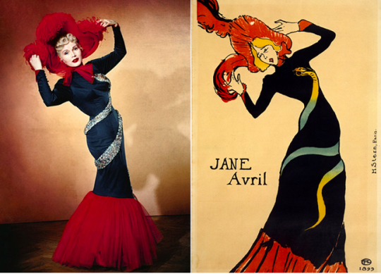 Zsa Zsa Gabor as Jane Avril in one of the film’s Oscar-winning costumes (left), and Jane Avril, 1899 Poster in the Toulouse-Lautrec Museum (right).