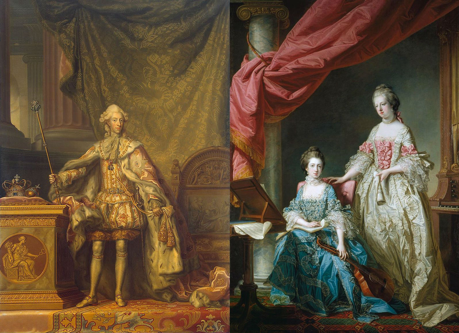 Christian VII of Denmark by Peder Als, in The State Hermitage Museum (left). Caroline Matilda of Great Britain (standing) by Francis Cotes, in the Royal Collection (right).