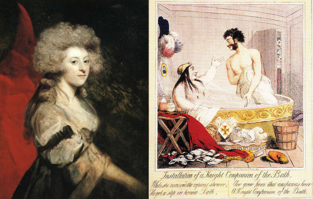Compared to the delicate Mrs. Fitzherbert by Joshua Reynolds (left), the “ugly” Queen Caroline suffered in the estimation of George, whose opinion is reflected in this cartoon of her cuckolding him with her reputed lover (right).