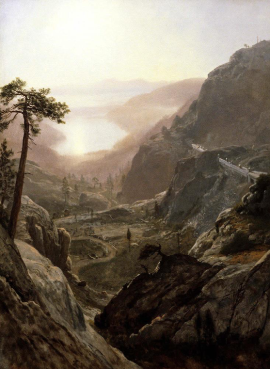 View of Donner Lake, California by Albert Bierstadt, in the de Young Museum.