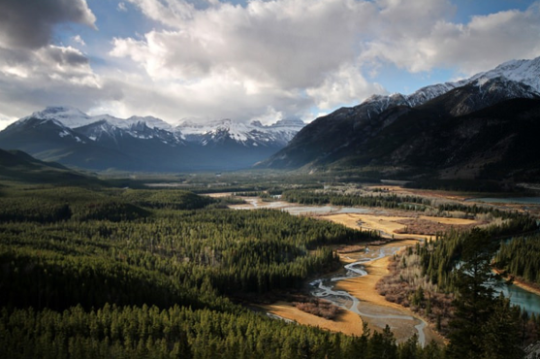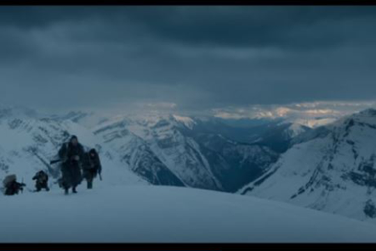 Frontiersmen crossing snowcapped peaks: scene from The Revenant.