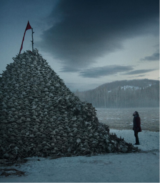 Director Inarritu and production designer Jack Fisk conceived of this image as a pyramid of human skulls, alluding to the genocide of Native Americans. After viewing a historic photograph of buffalo skulls stacked in a pyramid, they decided to recreate the real-life photo to represent the mass extinction of the buffalo, resulting from over-hunting by white settlers. Vareshchagin’s The Apotheosis of War offers a haunting glimpse of what the scene might have looked like with the original human skulls.