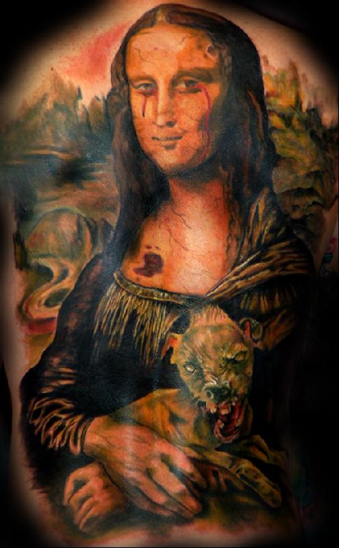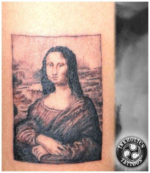Now we’re moving on the the more creative interpretations of this piece, and this one is super meta. It’s a tattoo of Mona Lisa… with tattoos. What?!