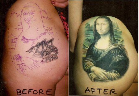 Someone with a shitty bat tattoo thought ‘Hey, why not cover it up with the Mona Lisa? That’s gotta be easier than a bat.’
