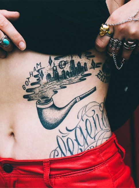 The pipe artwork on this tattoo is beautiful, BUT IT’S TOTALLY SCREAMING AT YOU WITH UNNECESSARILY LARGE AND ABRASIVE TEXT even though it’s purposefully a bit understated in the original image