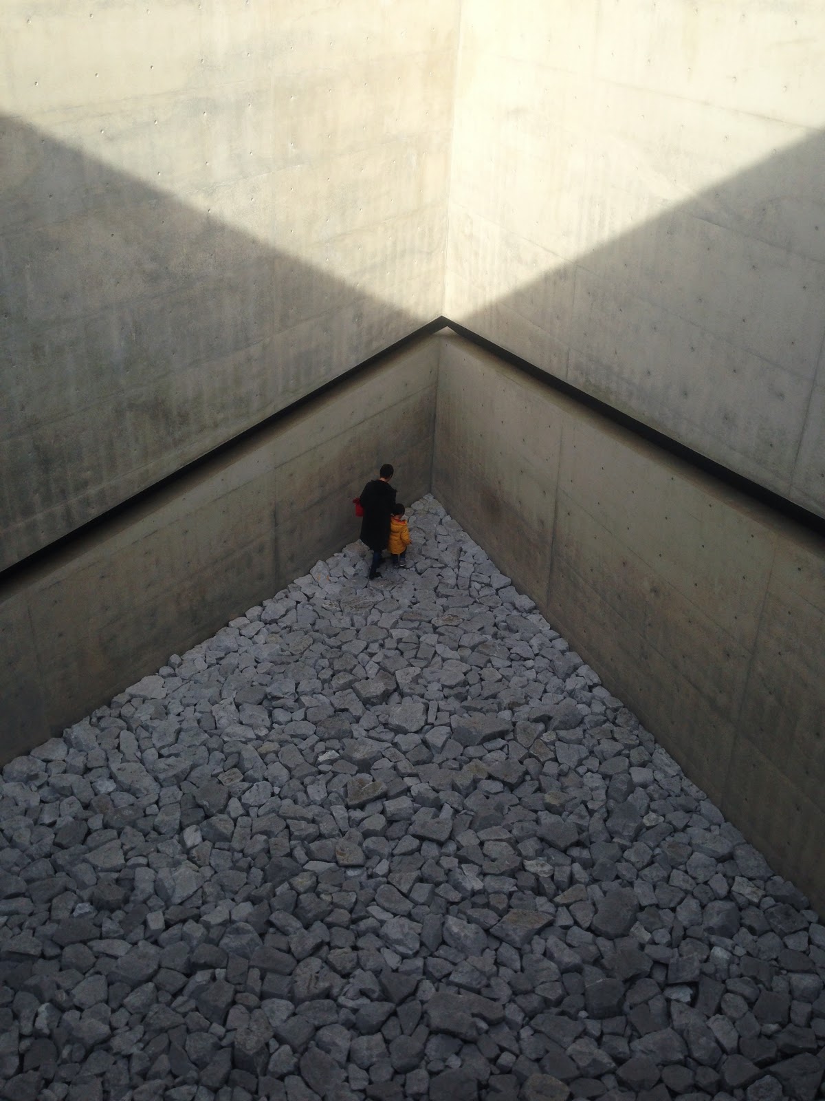 The building itself, by Tadao Ando, makes you walk slower just to be able to spend more time in the switchbacks and tilted hallways. Feeling like you’re in a movie, as my brother did, is to say that the rest of the world has fallen away and all that exists is your field of vision and the feelings you get from what you see. This museum, like Dia:Beacon, is almost entirely naturally lit. But it’s underground. Just experiencing that dry fact about the architecture is enough to get you pretty art-drunk. All of the light comes in through various geometric apertures cut into the earth, a triangle, a line, a rectangle in another rectangle, a circle, a pyramid skylight.