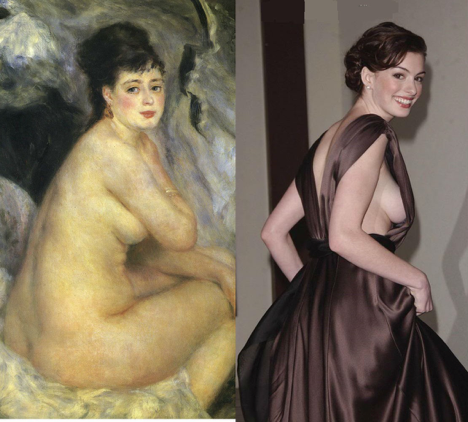 Nude Seated on a Sofa by Pierre-Auguste Renoir at the Pushkin State Museum of Fine Arts (left), and Anne Hathaway at the Mr. Abbott Awards, 2005 (right).