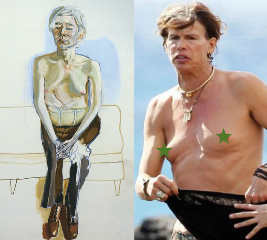 Don’t think you got off so easy, boys. We are nothing if not egalitarian. No reason why a gentleman can’t have a bad nipple day. Steven Tyler of Aerosmith shows off moobs to rival Andy Warhol by the queen of awkward nudity, Alice Neel. I do want to close my eyes…I really do!